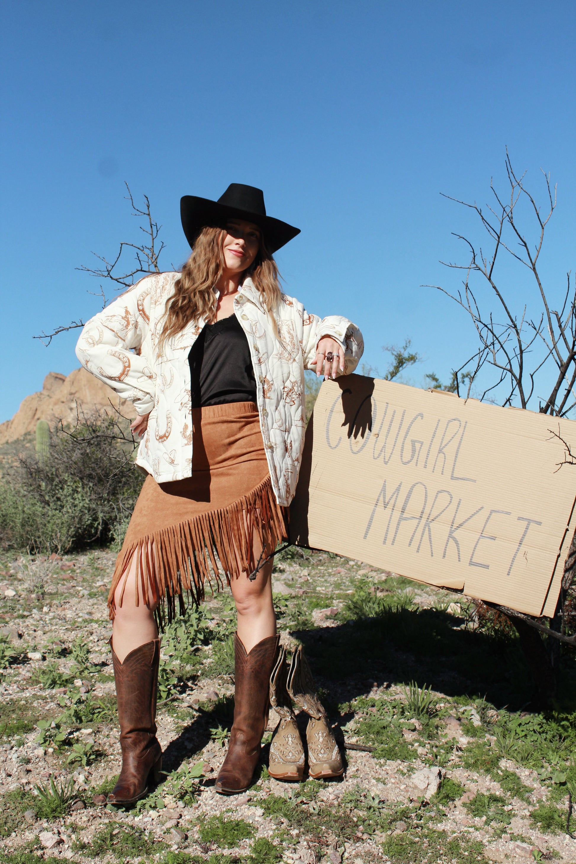 Oversized quilted shacket with classic western-themed illustrations